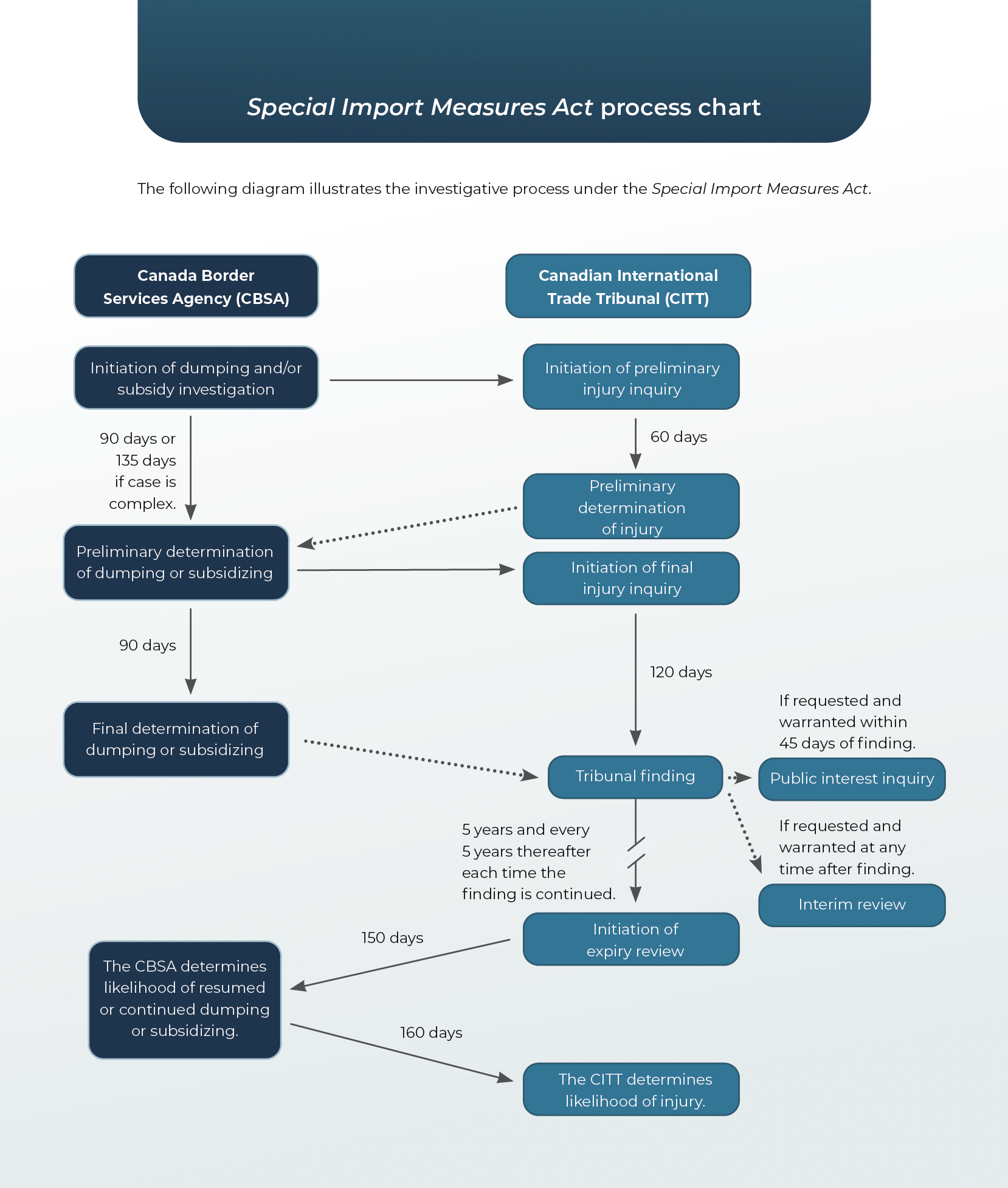 | 1969 | The Anti-dumping Tribunal becomes the Canadian Import Tribunal to reflect a broader mandate to conduct injury inquiries in both anti-dumping and countervailing duty proceedings under the newly adopted Anti-dumping Act, as well as in safeguard cases. |