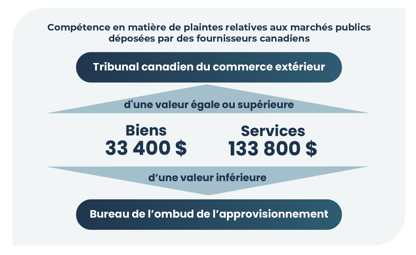 Le Tribunal enquête sur des plaintes déposées par des fournisseurs potentiels de certains biens et services. Il détermine si le gouvernement fédéral a manqué à ses obligations quant aux marchés publics dans le cadre de certains accords commerciaux. Le Tribunal examine si une soumission quelconque a été évaluée équitablement et en application des modalités régissant la procédure de marché public en question. Il peut recommander des mesures correctives et adjuger des frais.