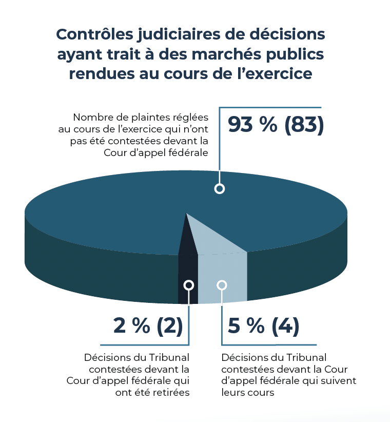 Six demandes de contrôle judiciaire ont été introduites à l’encontre d’une décision du Tribunal dans le cadre d’une plainte relative à un marché public. Deux de ces demandes ont depuis été retirées par le demandeur, et trois d’entre elles suivent toujours leurs cours à la fin de l’exercice financier.