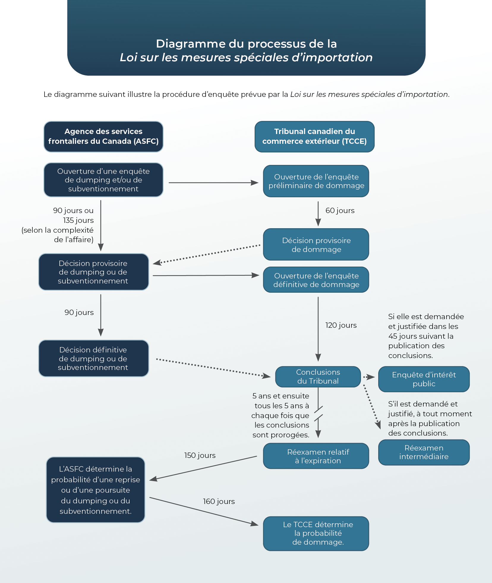 En vertu de la Loi sur les mesures spéciales d’importation (LMSI), le Tribunal détermine si le dumping ou le subventionnement de marchandises importées a causé un dommage ou menace de causer un dommage à une branche de production nationale. Le dumping survient quand des producteurs étrangers vendent leurs marchandises sur le marché canadien à un prix inférieur à celui de marchandises semblables dans leur propre marché intérieur ou à un prix qui ne couvre pas les coûts ni un montant raisonnable pour les bénéfices. Il y a subventionnement quand un gouvernement étranger offre un soutien financier ou autre à ses producteurs nationaux. Il peut en résulter des importations à bas prix qui inondent le marché canadien, perturbent les chaînes d’approvisionnement et causent un dommage aux concurrents canadiens, dommage qui, en fin de compte, touche les personnes qui ont pour emploi de fabriquer ces marchandises.